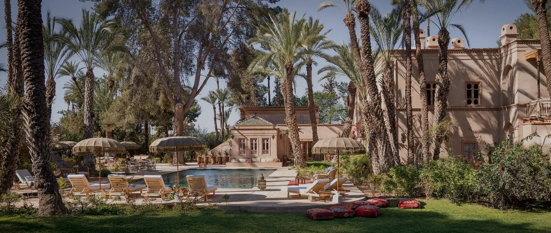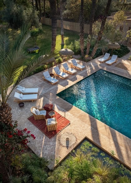 „Jnane“ bedeutet im Arabischen Garten – und tatsächlich bildet die Natur das Herz des Hauses. Das weitläufige Anwesen ist von über hundert Palmen sowie alten Oliven- und Pistazienbäumen geprägt. Versteckte Sitzplätze, schattige Terrassen und der ruhige Pool lassen den Alltag weit entfernt erscheinen.
