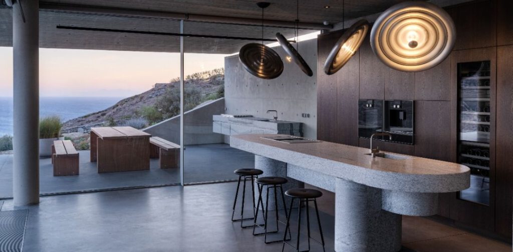 With a sweeping view over Elia Beach, the Aimasia Residence by A31 Architecture is not merely nestled in the landscape – it embraces it. The project reinterprets the island’s dry‐stone wall tradition, uses exposed concrete, planted flat roofs and refined material choices to create architecture that bridges nature and contemporary design.