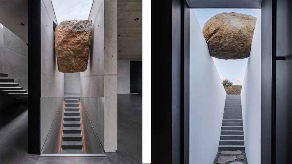 Materials reflect the site’s austere beauty: raw concrete left visible, ebonised oak for built‐in furniture, stone varieties in bathrooms. A suspended rock element hovers above a staircase – a sculptural nod to the geological surroundings.