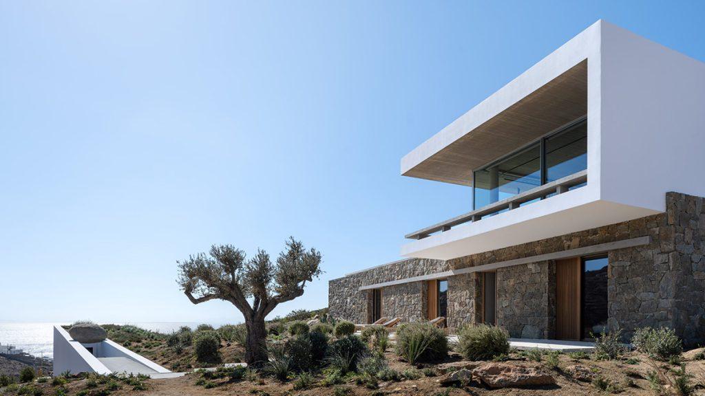 Rather than replicating the white cubic forms typical of the Cyclades, the Aimasia Residence opts for a distinctive architectural identity that still resonates with its setting. As the studio explains: