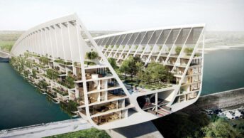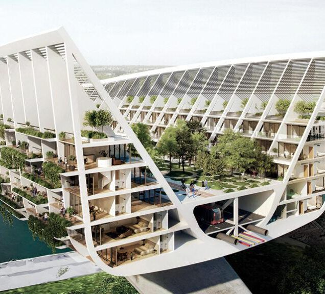 Die Green Bridge Düsseldorf: Ein visionäres Architekturkonzept von RKW Architektur+, das Nachhaltigkeit, urbanes Leben und Mobilität auf der Theodor-Heuss-Brücke neu verbindet.