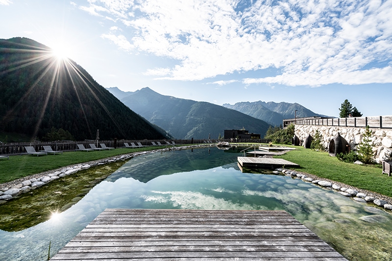Am Ende des Urlaubs springen wir noch einmal in den Badeteich und lassen das Panorama der Berge auf uns wirken. Der im Garten angelegte Badeteich wird übrigens auch mit Solarenergie beheizt.