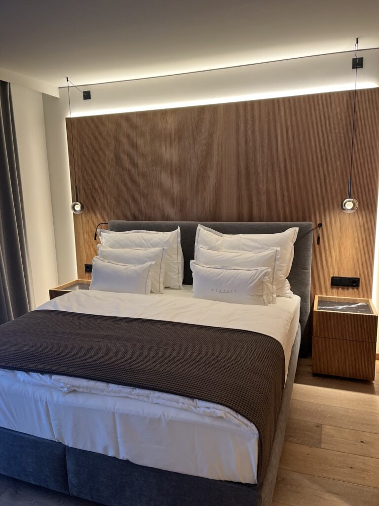 Vom warmen Licht der Occhio-Leuchten umhüllt, wartet hier schließlich auch noch ein Wittmann-Möbelstück geduldig darauf, dem Gast die Ruhe zu schenken, die in ihm wohnt: nämlich ein handgemachtes Bett mit Matratze, für deren Herstellung alleine 115 Arbeitsschritte notwendig sind. Muss ich also erwähnen, wie gut ich geschlafen habe? Vermutlich nicht. Oder vielleicht doch, denn am nächsten Tag wurde ich von meinem Mann empfangen mit den Worten: „Du siehst so entspannt aus.“ Und das ist wohl der beste Grund, um ins Kamptal zu fahren.