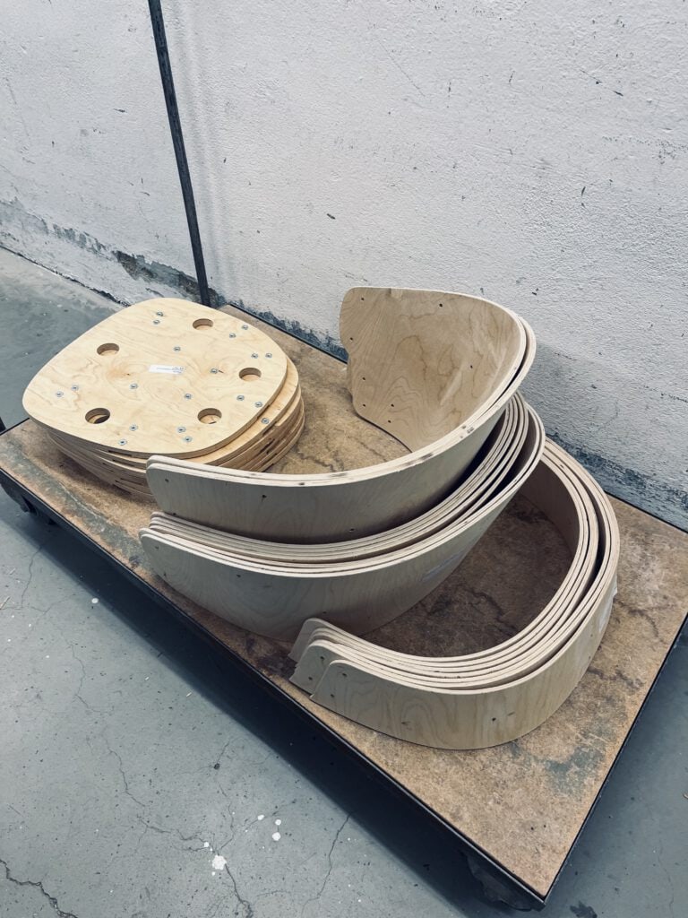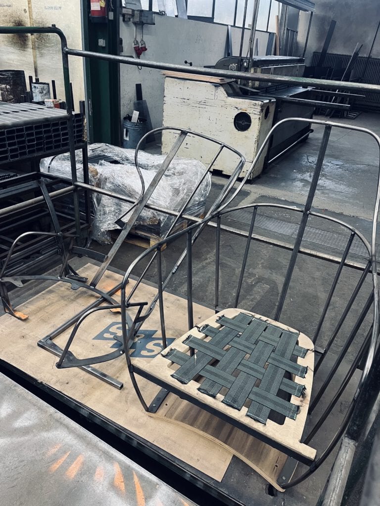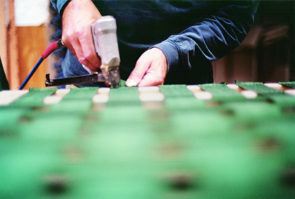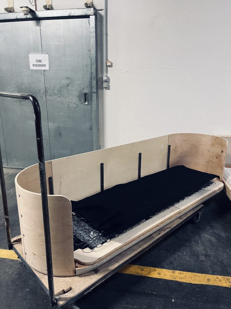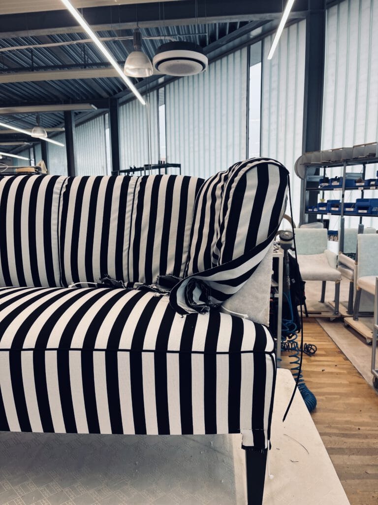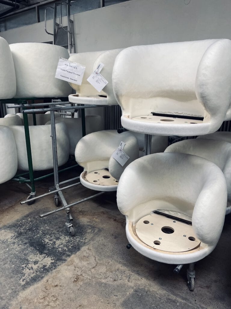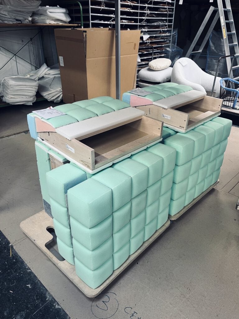 In der Schlosserei startet der Produktionsprozess mit maßgefertigten Metallrahmen. Von dort führt der Weg durch die Lagerhalle mit ihren vorgefertigten Holzkonstruktionen weiter zur Begurtung und dann in die Vorpolsterei. Hier fallen zuerst die Farben ins Auge – Schaumstoffe in Gelb, Blau, Rosa. Nicht etwa aus gestalterischer Absicht, jede Farbe steht schlichtweg für eine andere Dichte. Schicht um Schicht werden sie wie ein Sandwich verklebt, manchmal sogar auf derselben Ebene kombiniert, um genau jene feinen Eigenschaften zu erzeugen, die man später nicht mehr sieht.