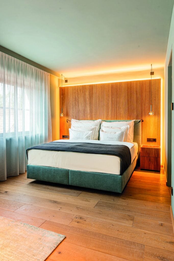 Vom warmen Licht der Occhio-Leuchten umhüllt, wartet hier schließlich auch noch ein Wittmann-Möbelstück geduldig darauf, dem Gast die Ruhe zu schenken, die in ihm wohnt: nämlich ein handgemachtes Bett mit Matratze, für deren Herstellung alleine 115 Arbeitsschritte notwendig sind. Muss ich also erwähnen, wie gut ich geschlafen habe? Vermutlich nicht. Oder vielleicht doch, denn am nächsten Tag wurde ich von meinem Mann empfangen mit den Worten: „Du siehst so entspannt aus.“ Und das ist wohl der beste Grund, um ins Kamptal zu fahren.
