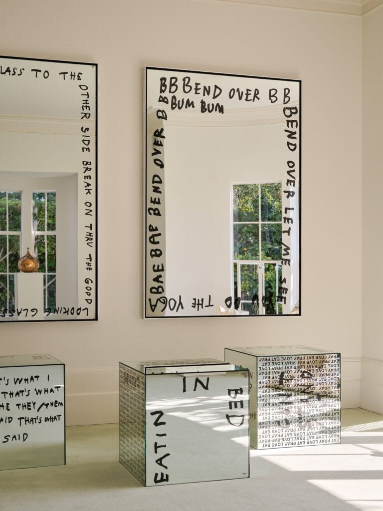 Dass Wearstler für dieses Projekt keinen neutralen Saal, sondern ihr privates Anwesen in Beverly Hills gewählt hat, spricht Bände über ihre persönliche Verbundenheit mit Side Hustle. Das historische Poolhouse ihres Hauses, einst privater Kinoraum mit James-Bond-Atmosphäre, dient als Ausstellungsort der Debütshow „Again, Differently“. Dort zeigt sie Werke internationaler Künstler:innen wie Dozie Kanu, Joana Schneider oder Sam Klemick und setzt damit einen neuen, lebendigen Impuls für kreativen Austausch.