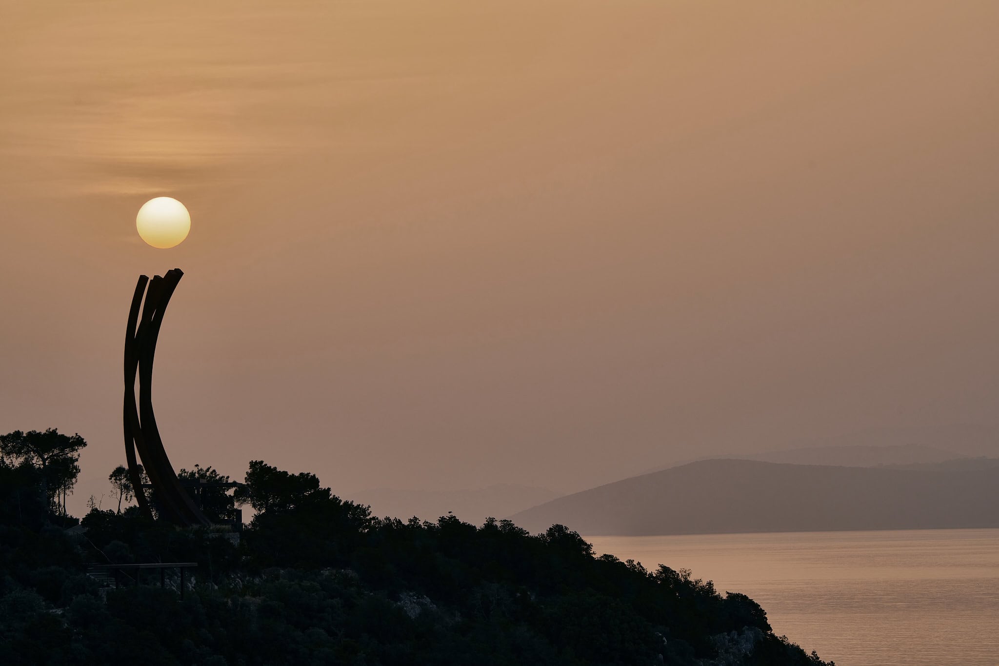 Am Yachthafen empfangen monumentale Bögen aus Cortenstahl des französischen Bildhauers Bernar Venet die Gäste – kraftvolle Symbole für Stabilität und Bewegung zugleich.