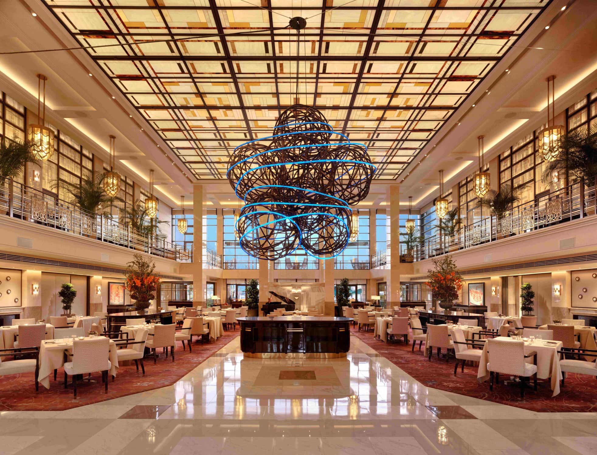 Im mit zwei Michelin-Sternen ausgezeichneten Restaurant Ocean greift die portugiesische Textilkünstlerin Vanessa Barragão das Thema Meer auf – ihr handgefertigtes Wandobjekt aus recycelten Materialien erinnert an die Schönheit und Zerbrechlichkeit der Ozeane.
