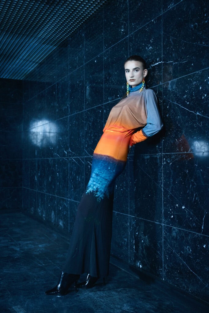 Entstanden ist die Kollektion in kreativen Rückzugsorten: im Ostseebad Ahrenshoop und am Tegernsee. Fernab des gewohnten Modezirkus fand der Designer Ruhe, Klarheit und neue Fokussierung. Die Natur wurde dabei nicht nur zur Inspirationsquelle, sondern zum aktiven Gestaltungsraum. Fotografisch festgehaltene Abendstimmungen – das tiefe Blau der Ostsee, glühende Sonnenuntergänge über dem See – wurden direkt in Prints übersetzt und bilden das emotionale Herz der Kollektion.