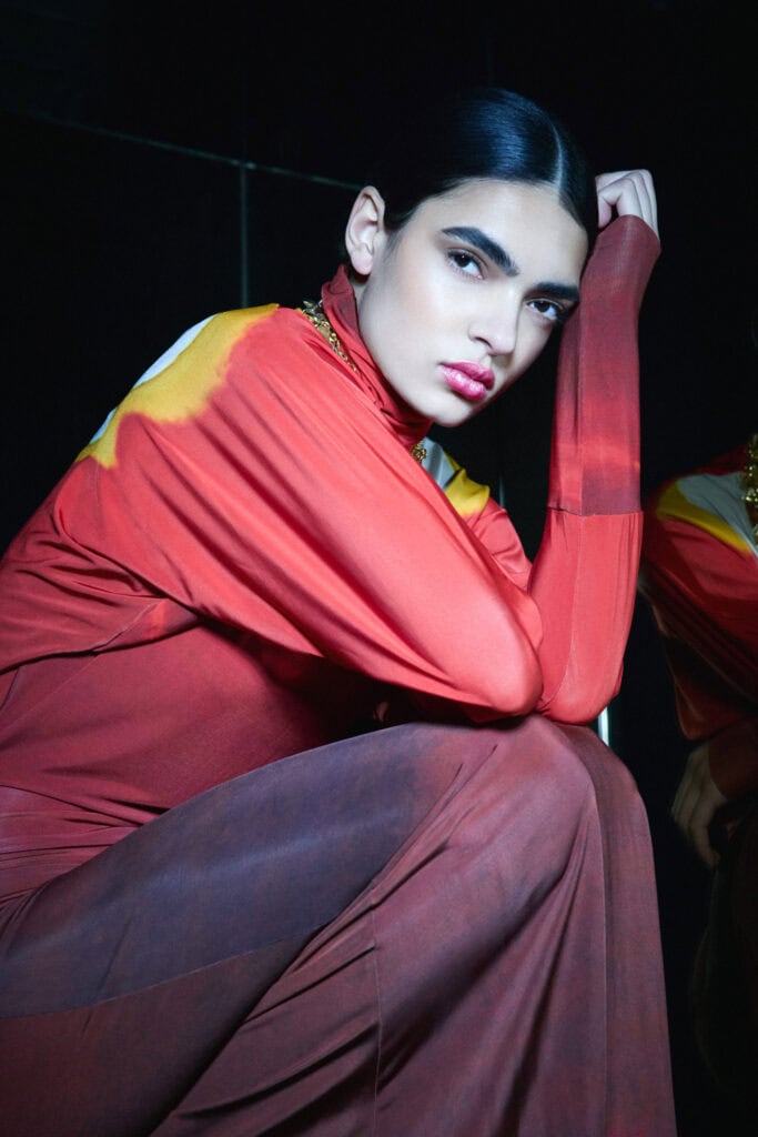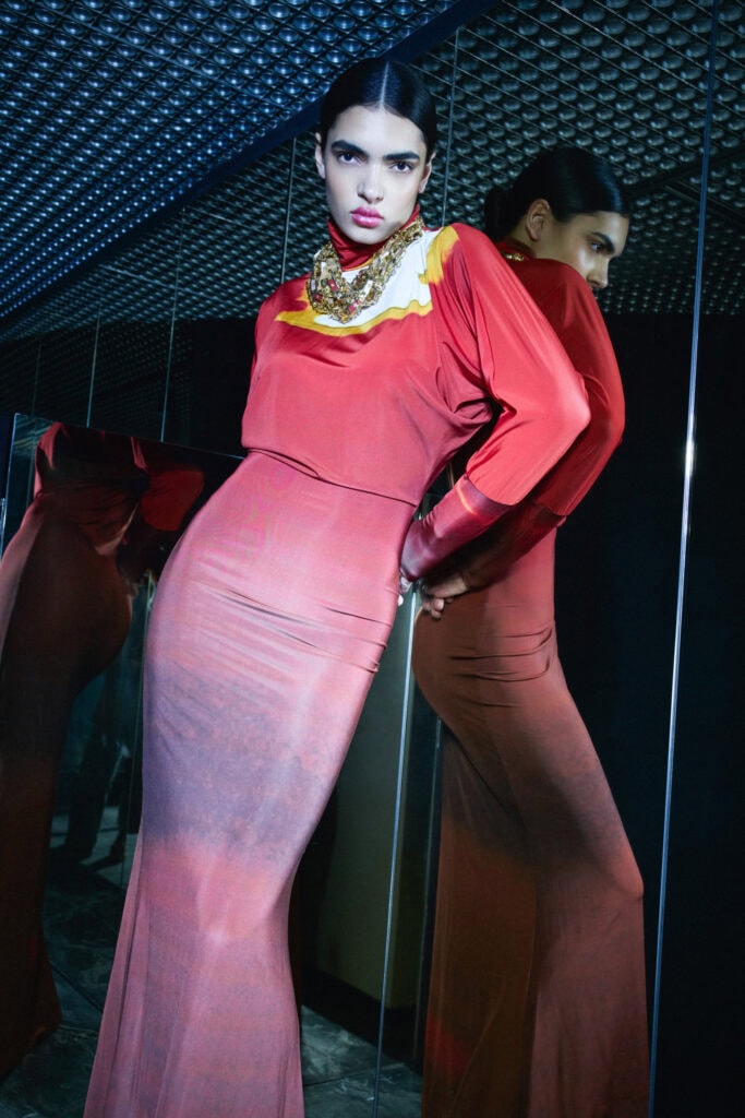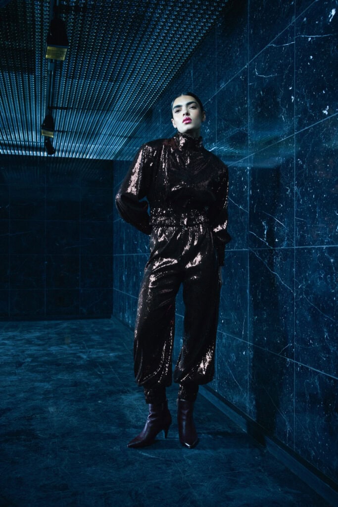 Glamour bleibt ein fester Bestandteil der Ostertag-DNA. Schwarze Pailletten verschmelzen mit schimmerndem Kupfer, Retro-Silhouetten der 70er-Jahre werden neu interpretiert und in die Gegenwart transportiert. Selbst der klassische Jogginganzug erhält ein glamouröses Update – ein selbstbewusster Stilbruch, der zeigt: Diese Kollektion will nicht gefallen, sondern erzählen.
