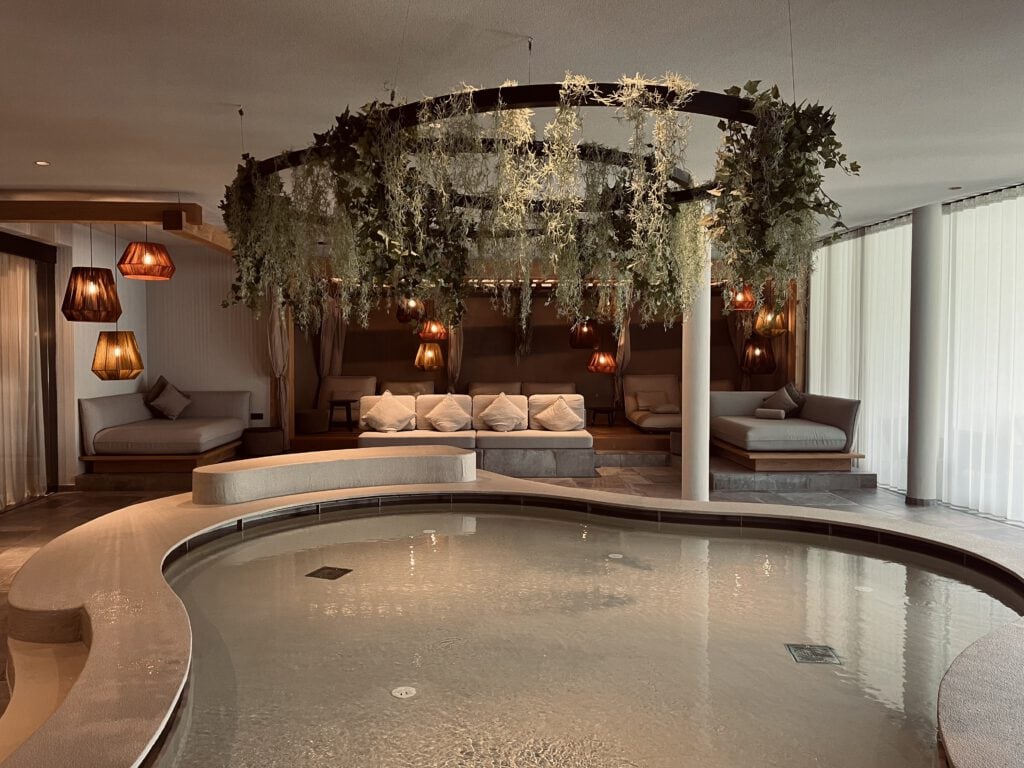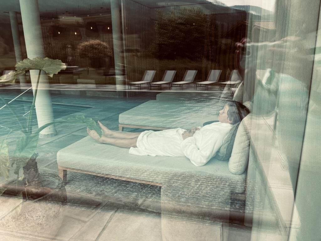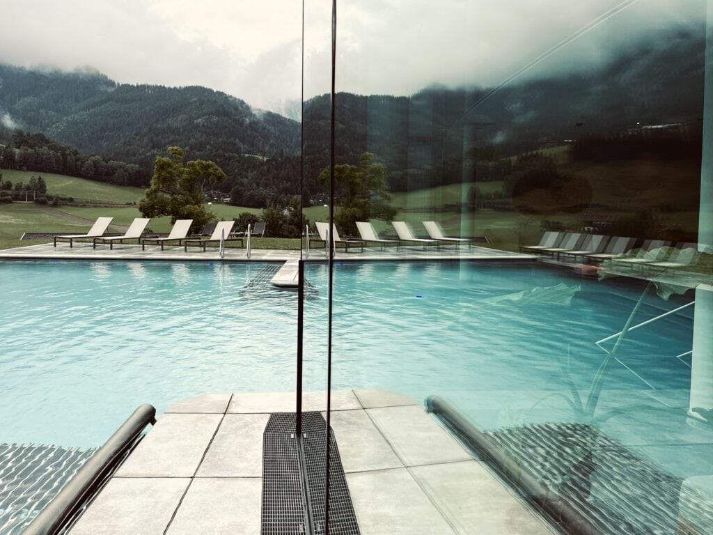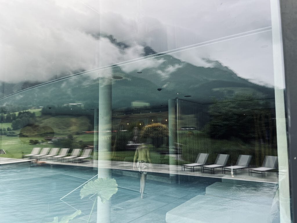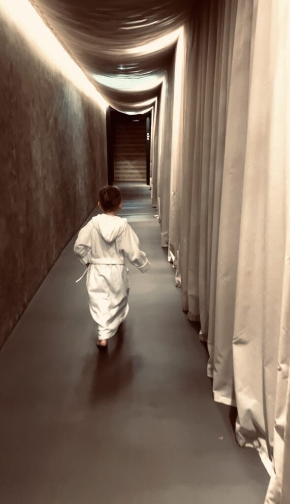 Das Wort Pool reicht aus uns alle drei ziehen sich in Windeseile um. Sie schlüpfen in die teils entzückend überdimensional wirkenden Bademäntel und Schlapfen, um sich nach wenigen Minuten wieder derer zu entledigen und ins Kinderbecken zu hüpfen. Der Große stellt sich der Challenge, den erfrischenden Badeteich ohne die Miene zu verziehen zu durchschwimmen. Und alle staunen über die automatischen Schiebetüren, die im großen, warmen Pool ins Freie führen.