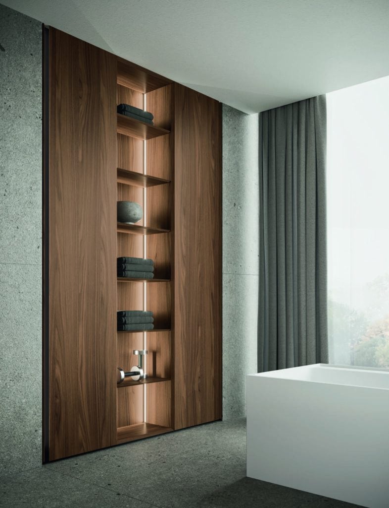 Die integrierte Griffnut ersetzt klassische Griffe und unterstreicht die puristische Linienführung. Neu sind auch Elemente wie Glas-Seitenteile und offene Spalten mit integrierter Beleuchtung, die dem Raum Tiefe und Atmosphäre verleihen.
