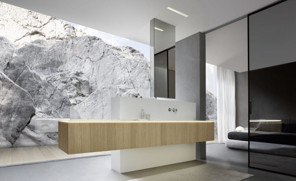 Die Waschbeckenplatten sind in Milltek Solid, Corian, Gres Laminam, MDi oder Marmor erhältlich – wahlweise mit integrierten Becken oder als Aufsatzlösung.