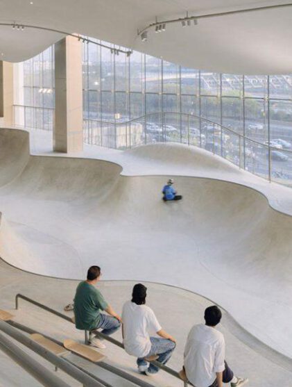 The Moreprk Skyline Skatepark by AAN Architects in Shanghai’s Xuhui District combines architecture, sport, and skyline views in a spectacular skatepark 20 meters above the city.