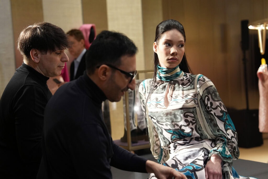 NEW YORK, NEW YORK – FEBRUARY 11: A model prepares during the Sergio Soldano Brand Revival Event and F/W 2026 Womenswear Collection Presentation at Printemps on February 11, 2026 in New York City. (Photo by Sean Zanni/Getty Images for Sergio Soldano)