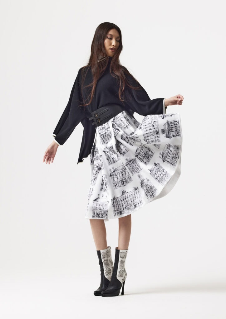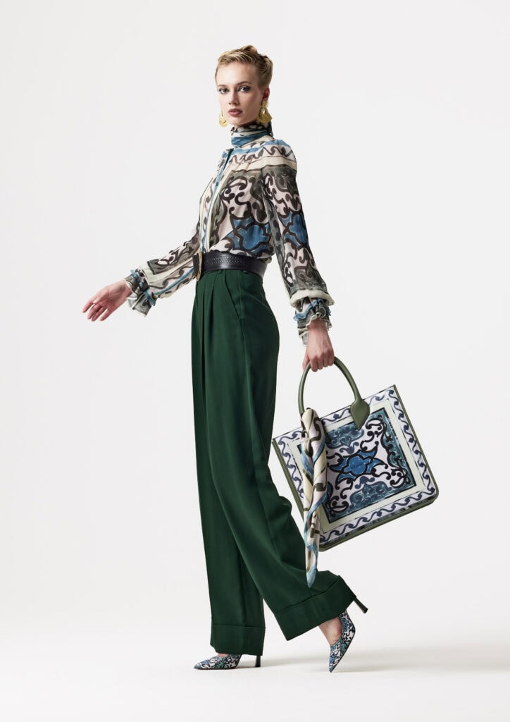Eine Hommage an Genua – Geburtsort des Maestros. Historische Palazzi und urbane Perspektiven werden zu grafischen Seidenprints und klaren Linien. Die kulturellen Wurzeln des Hauses bilden das Fundament seiner Zukunft.