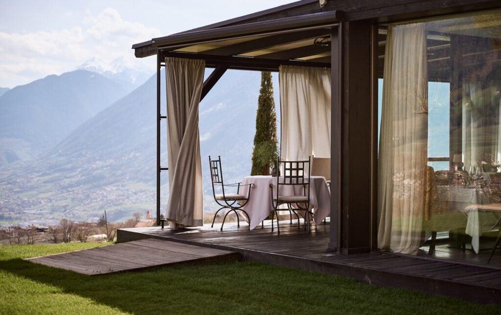 Meran liegt einem zu Füßen, dahinter die Berge, darüber der Himmel. Dem Ausblick entkommt man nicht. Er raubt einem den Atem und befriedigt die Sehnsucht nach Weite. Und doch sieht man in ihm stets etwas Neues. Je nach Jahreszeit ist er weich, klar oder dramatisch. Manchmal grau oder blau, dann wieder rosa oder golden.