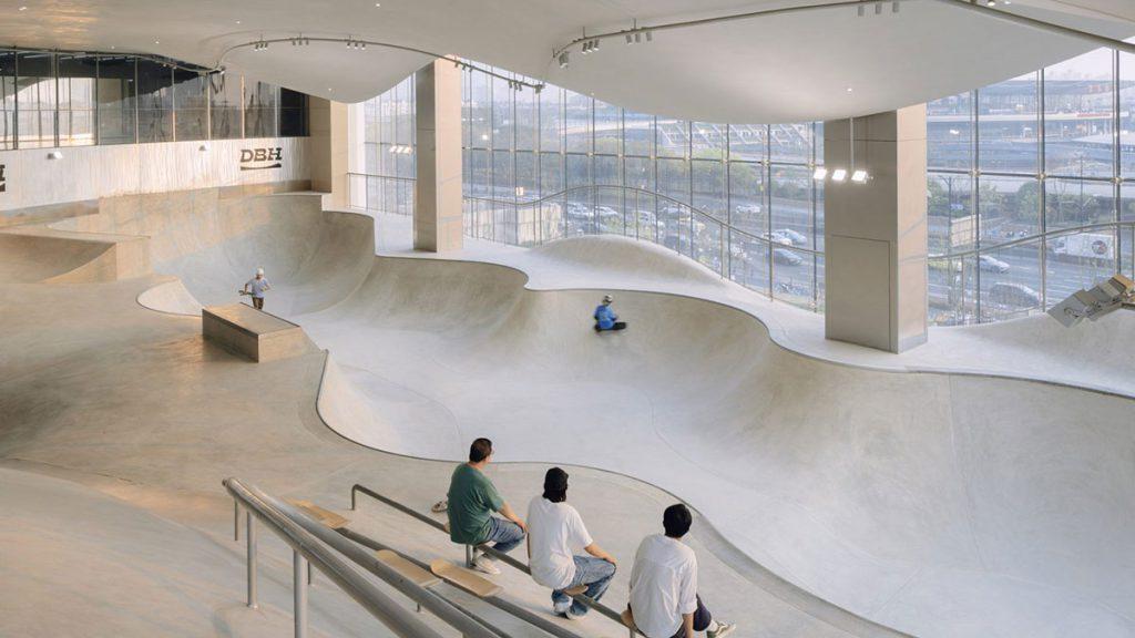 Die Anlage befindet sich auf der dritten und vierten Etage des Einkaufskomplexes Xuhui Vanke Center. Dank der unmittelbaren Nähe zum Shanghai South Railway Station ist der Komplex hervorragend angebunden und dient als Anlaufstelle für so ziemlich alles: Einzelhandel, Büros, Gastronomie und Freizeitangebote vereinen sich hier unter einem Dach. In Form einer Glasbox schwebt der Skatepark geradezu über dem Gebäude, während das Innenleben von der Stadt selbst bestimmt wird. Denn das Architekturbüro orientierte sich beim Design des Skateparks direkt an der Skyline. Die Konturen der Hochhäuser wurden in geschwungene Skateflächen und Rampen übersetzt, die fließende Bewegungen simulieren sollen.