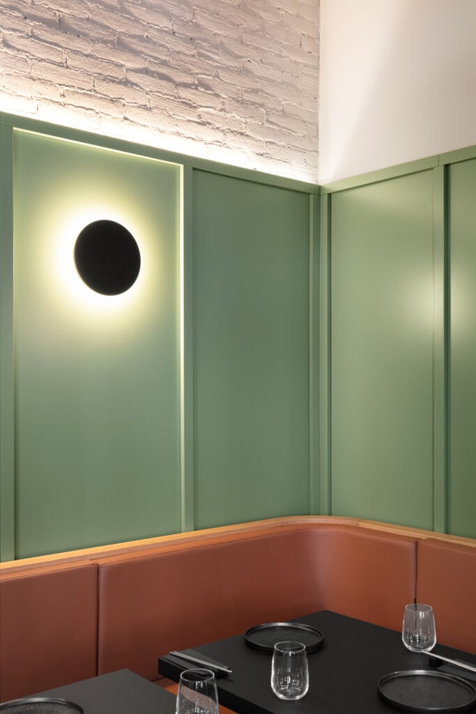 Answering the client’s request, the space’s sectioning was reduced from three parts to two, following the desire to have a semi-independent entrance area and the restaurant area in the same section as the outdoor space. Especially in summer, this allows for inside/outside continuity thanks to the open windows.