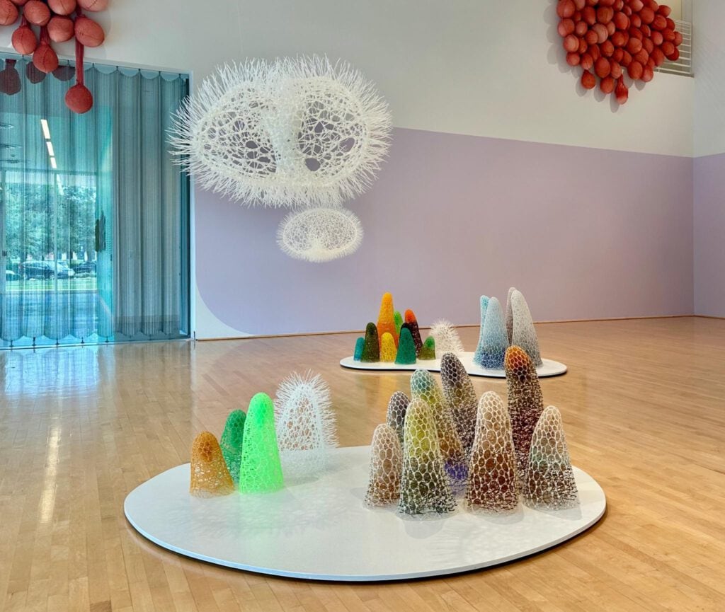 Park steuert zur Ausstellung beides bei: eine Außenkommission und Inneninstallationen aus ihrer Microcosm-Serie – Modulstrukturen, die den Raum wie lebendige Netze füllen.