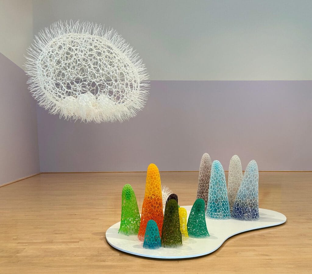 Sui Park contributes both an outdoor commission and a series of indoor installations made of floor-based and suspended zip tie sculptures. Her Microcosm pieces expand through the galleries like living organisms — translucent, rhythmic, and self-supporting.