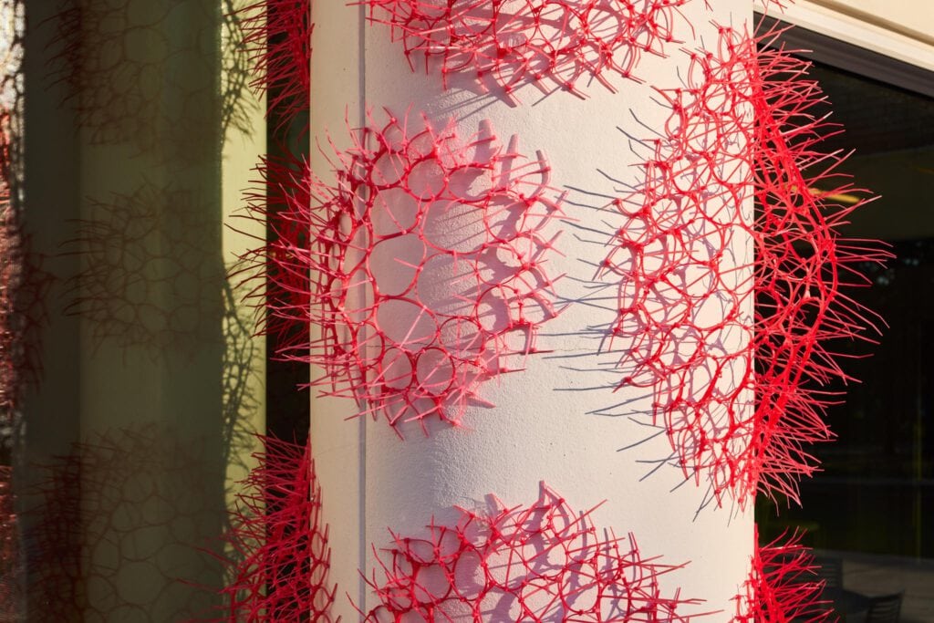 In her exhibition Bio Morphe at the Moody Center for the Arts in Houston, Sui Park unfolds a delicate choreography between interior and exterior space. Her woven sculptures – crafted entirely from zip ties – seem to float and expand, creeping across floors and walls, growing like living networks. What begins as industrial plastic becomes, in her hands, a breathing organism.