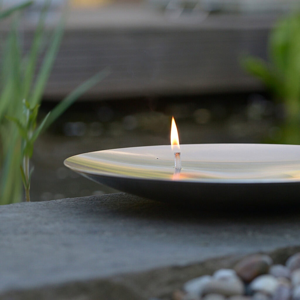 Made of matte brushed stainless steel, the fire bowl impresses with its clean, concave shape in which the flame appears to float, creating a unique play of light. Inside, a hidden reservoir is filled with lamp oil, allowing the flame to burn evenly and for an extended period.