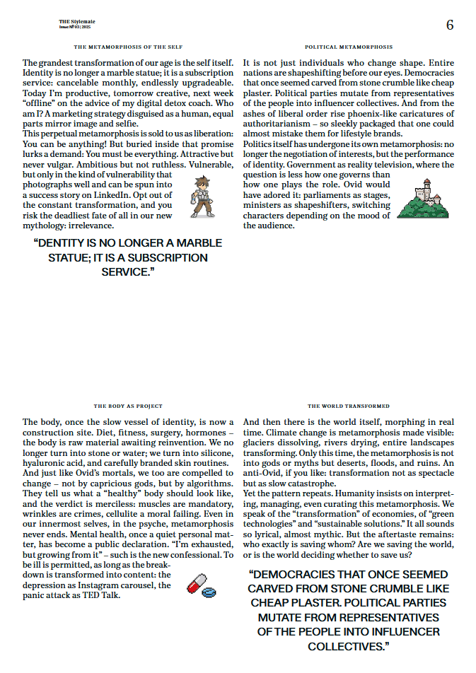 Under the theme “Time to Shift”, we look at metamorphosis in many forms: political and ecological transitions, identity in beta, and rituals that bring back energy in everyday life. The essays and features reframe stability as a living process between a changing world and the freedom to reinvent ourselves.