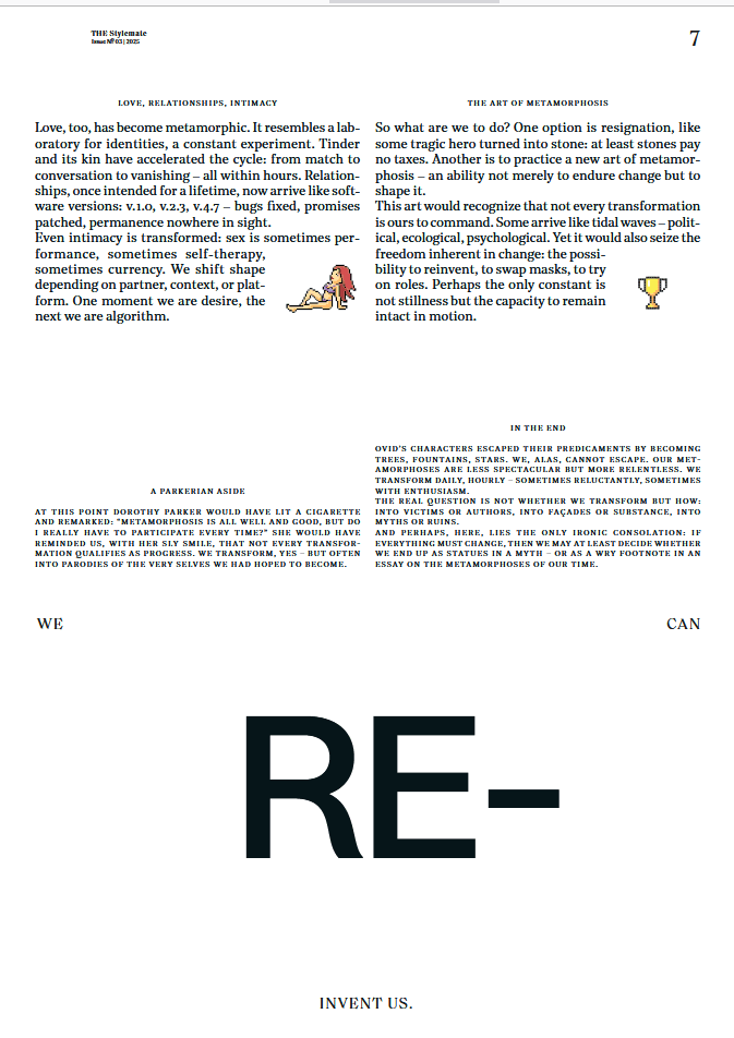 Change isn’t a trend – it’s a principle of life. THE Stylemate No. 03 | 2025 explores the moment of transformation: metamorphoses in society, design, architecture, fashion – and within ourselves. A magazine about letting go, rediscovering and consciously shaping transitions.