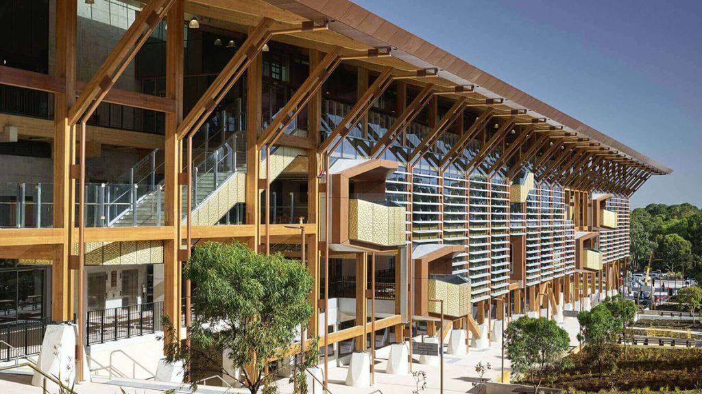 Perth is home to the largest mass-engineered timber building in the southern hemisphere: the university complex named Boola Katitjin. Designed by local firm Lyons Architects with a length of 180 metres, the building used prefabricated elements sourced from Europe.
