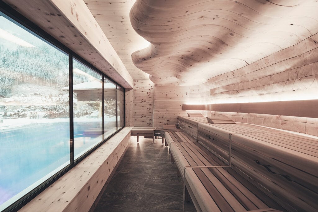 The spa at the Nesslerhof is conceived as a counterbalance to the outdoors. Indoor and outdoor pools, an infinity pool overlooking snow-covered peaks, saunas, quiet zones and a natural swimming pond form a landscape of rest and recovery.