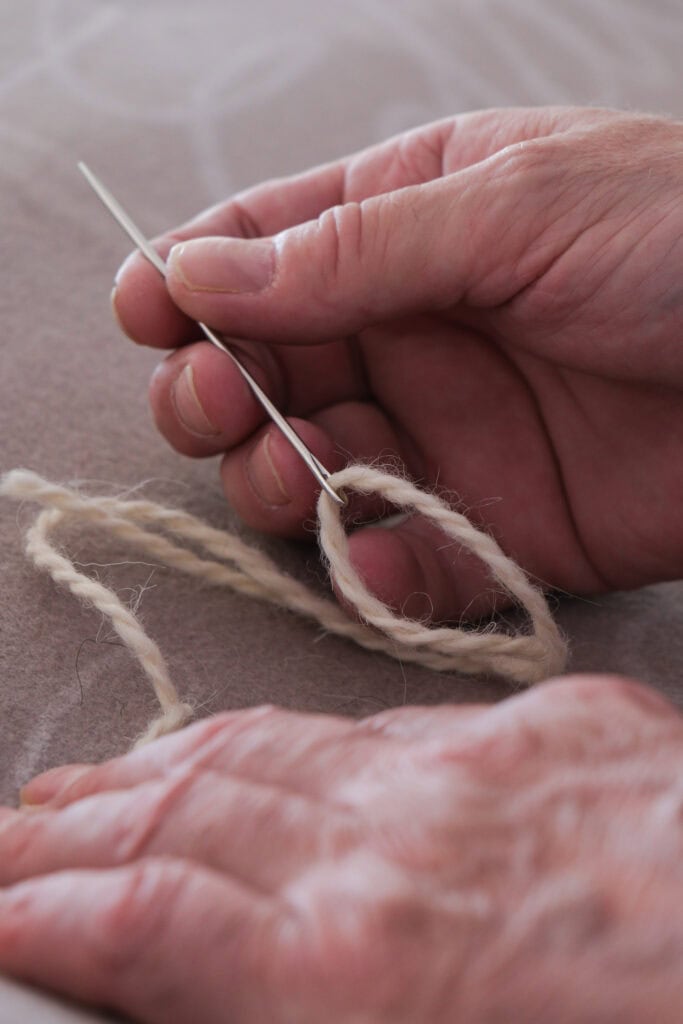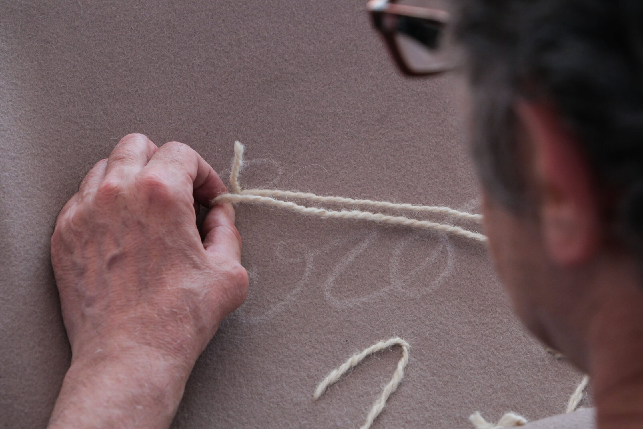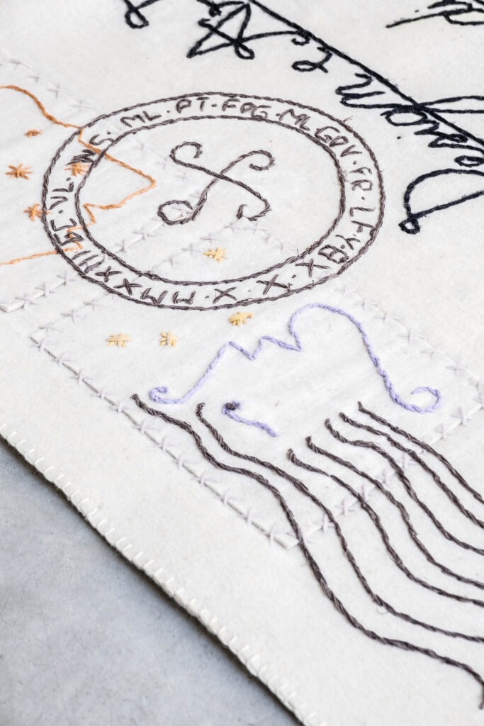 Crafted from natural Alpine wool felt from South Tyrol and entirely hand-embroidered using stem stitch, the piece (150 x 225 cm) becomes a spatial memory—a dialogue between past and present.