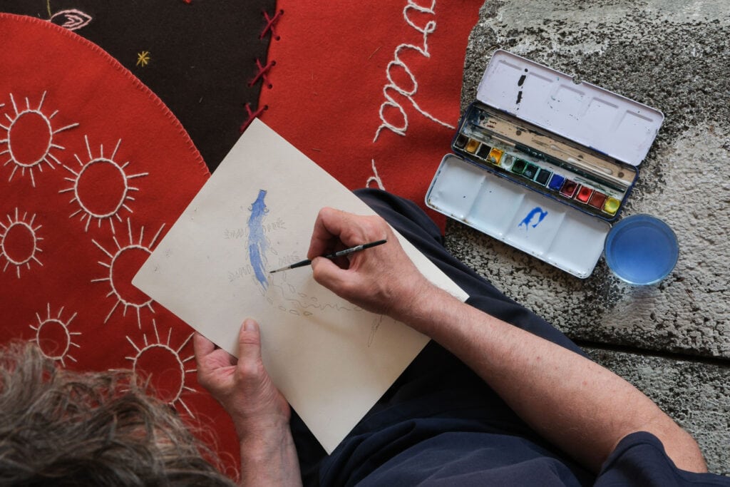 A former journalist, self-taught artist, and poet by vocation, Giulio Caponi pursues a creative path where word, image, and material merge. His works originate from fragments—memories, impressions, reflections—that first emerge as intuition, then take shape as drawings, and finally become embroidery.